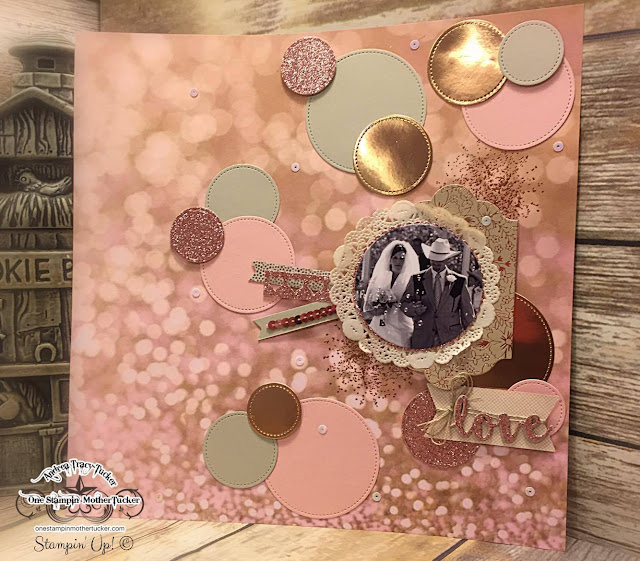 Okay, Okay!!! I am over achieving! This layout turned out better than I thought. I was really kind of overwhelmed when I started... So glad Justin Krieger helped me out! Yes the picture is of our wedding! I just love that you could see the bubbles! So we played off of the bubbles and this AWESOME paper by using various sizes of the Stitched circles in Sahara Sand, Blushing Bride and Copper Foil. There are some sequins on here as well from the Cupcakes & Carousel Embellishment Kit. The picture is adhered to a Blushing Bride Glimmer Paper scalloped circle from the Layering Circles dies and adhered to the doily.